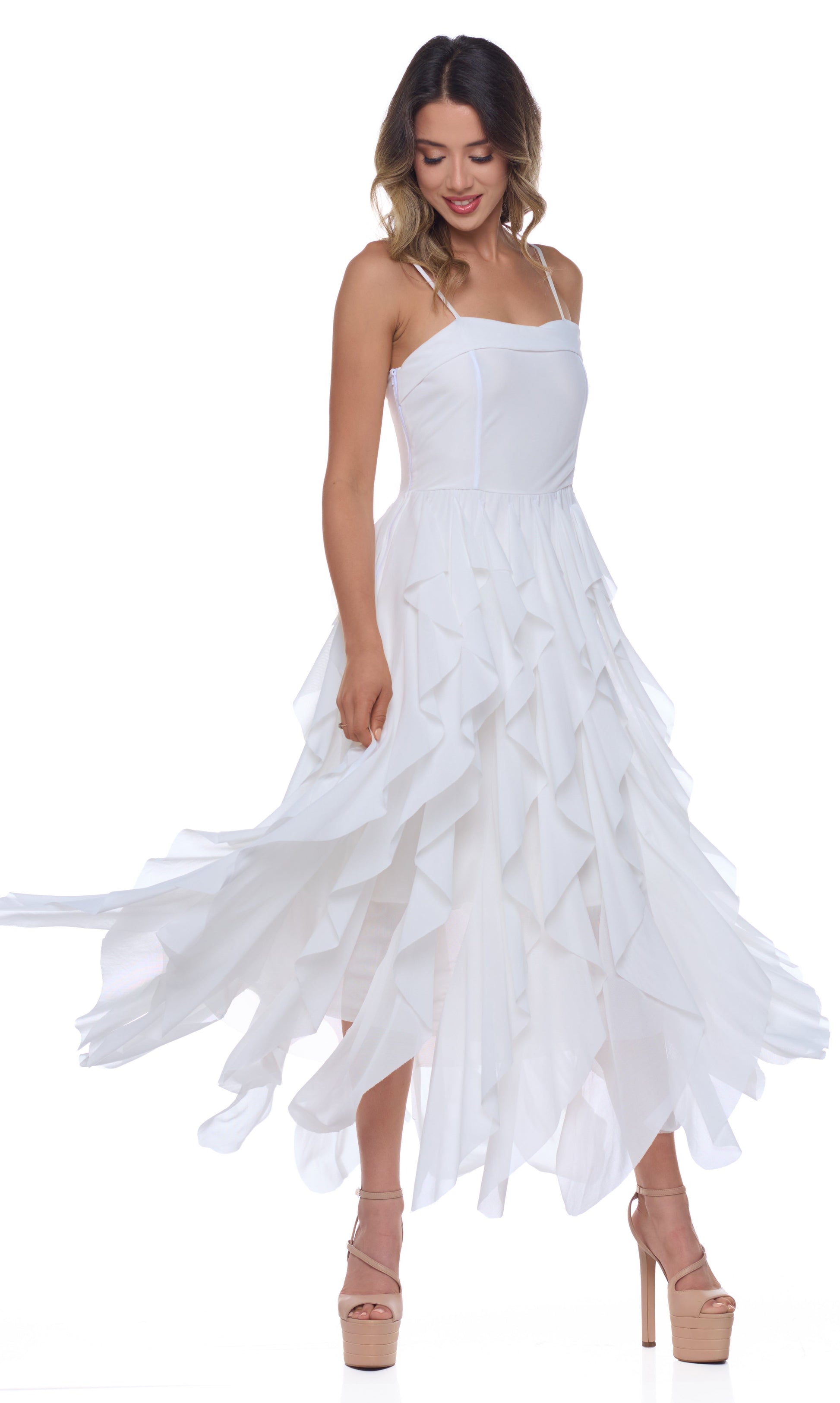 Float effortlessly in this dreamy ankle-length dress, designed with adjustable spaghetti straps for a customizable fit. Featuring ethereal mesh-layered ruffles, a soft lining for comfort, an elastic back for ease, and a side invisible zipper for a smooth silhouette, this piece captures modern romance with refined detail.