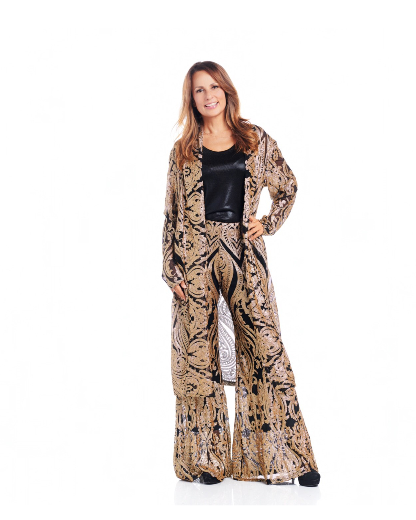 This breathtaking DAMASK duster jacket is a true statement piece. Fully hand-beaded in bold gold and black sequins on sheer black mesh, it exudes opulence and sophistication. Hidden side pockets add a touch of functionality without compromising the sleek silhouette. Whether styled with the matching pant or a flowing full skirt for an elegant evening look or dressed down with jeans and a sleek top for a chic daytime affair, this jacket effortlessly elevates any outfit.