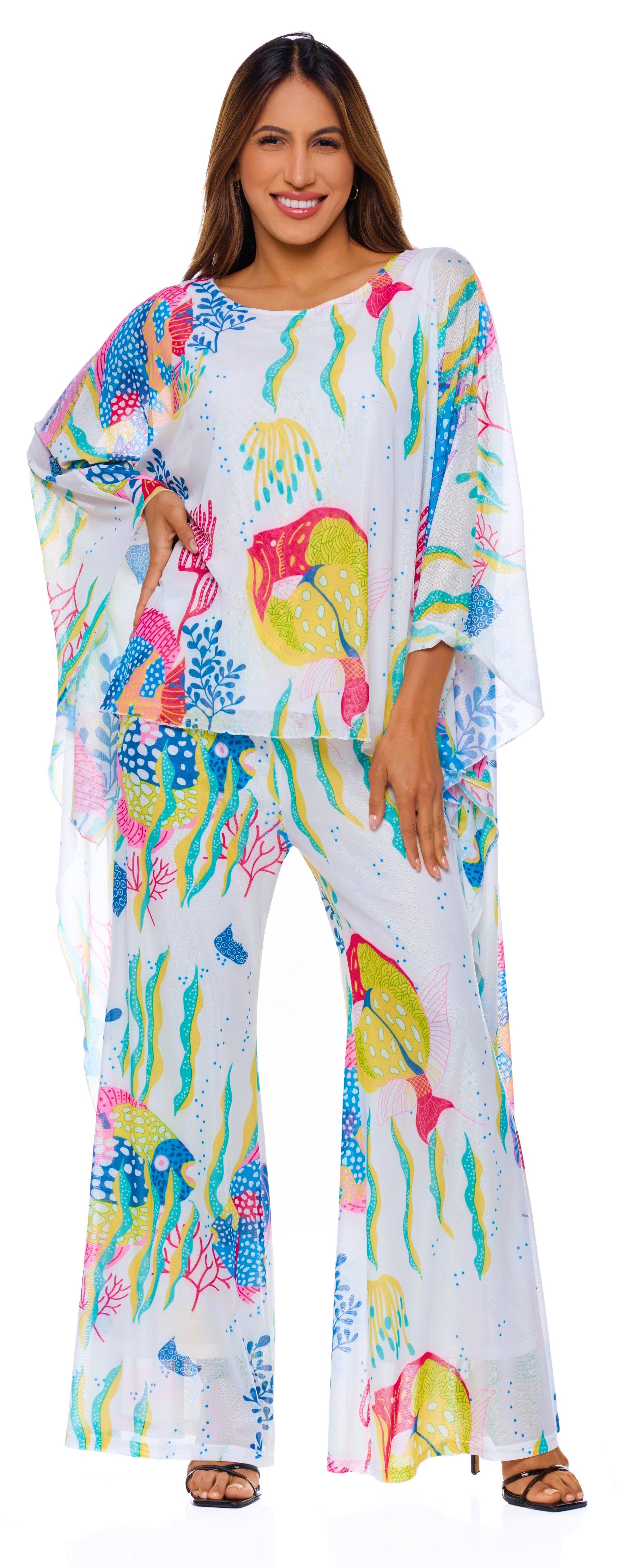 Elevate your style with the Koi Fish Mesh Pants, a bold yet effortlessly chic piece designed for versatility and comfort. Crafted from lightweight white mesh with a soft lining, these statement pants feature vibrant koi fish swimming in a sea of colorful coral reefs, turning every movement into a flowing work of art. Designed for both comfort and sophistication, the elastic waistband provides a flexible, easy fit, making these pants as effortless as they are eye-catching. The lined design ensures full coverage while maintaining the breathable, airy feel of mesh. Style them with the matching Koi Fish Mesh Angel Top for a striking coordinated look, or pair them with a simple tank or fitted bodysuit for a more understated yet fashion-forward ensemble. Whether you're dressing them up with heels or keeping it casual with sneakers, these pants bring a perfect balance of luxury, edge, and wearability.