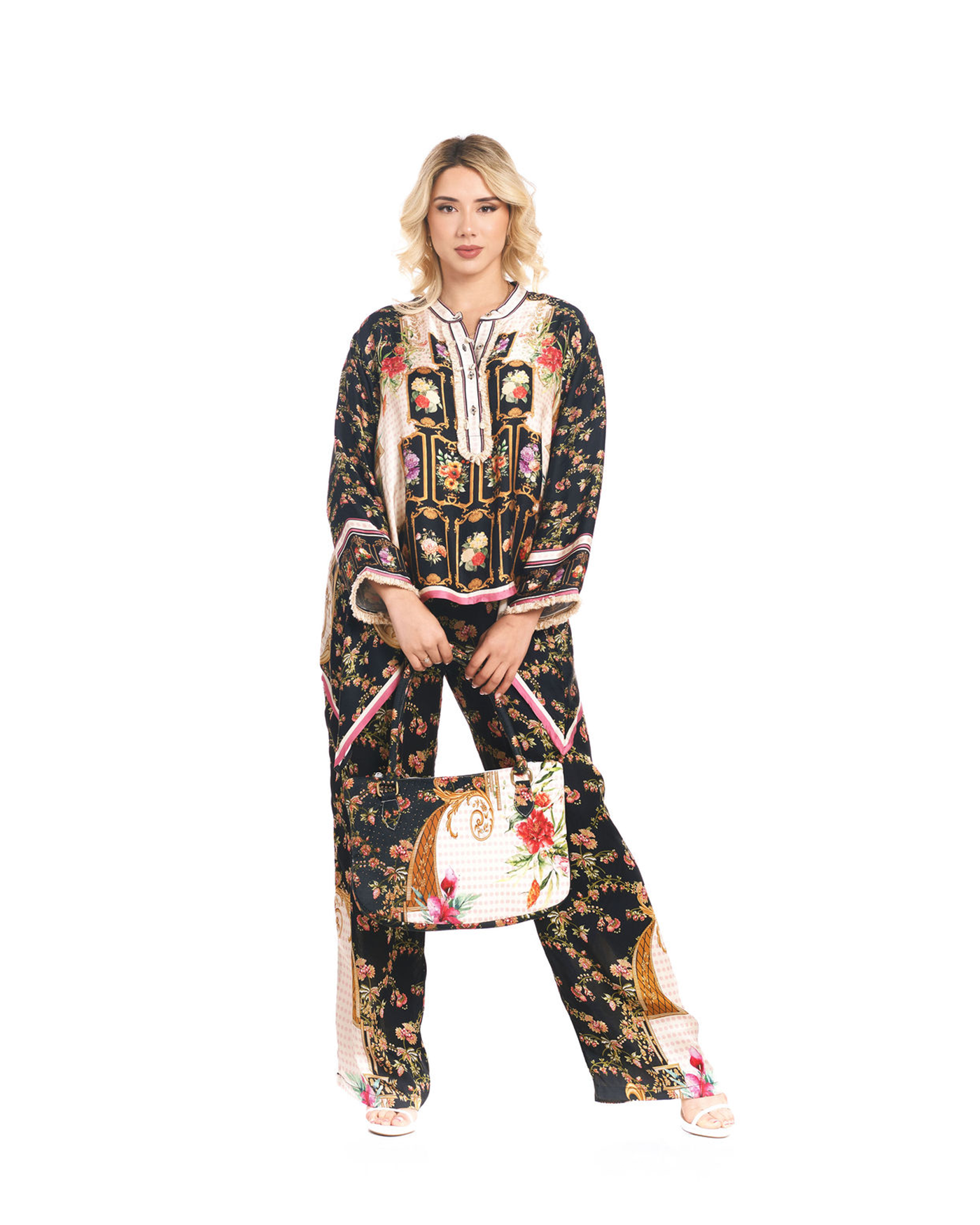 The perfect finishing touch of our NOIR handbag which is crafted from 100% cotton in the signature bold Greek Nocturne black floral print, offering structure with softness and elevated everyday style. Designed with elegant gold-tone ring double handles, a top zipper closure, and a detachable shoulder strap for versatile carry options. Inside, you’ll find a dedicated cell phone pocket to keep your essentials organized. Sized at 10" x 15.5" (26cm x 40cm), it’s spacious enough for daily use yet polished enough to complete your look—from daywear to evening outings. Pair it with the matching top, pant, or dress for a coordinated statement, or let it stand alone as a bold accessory.