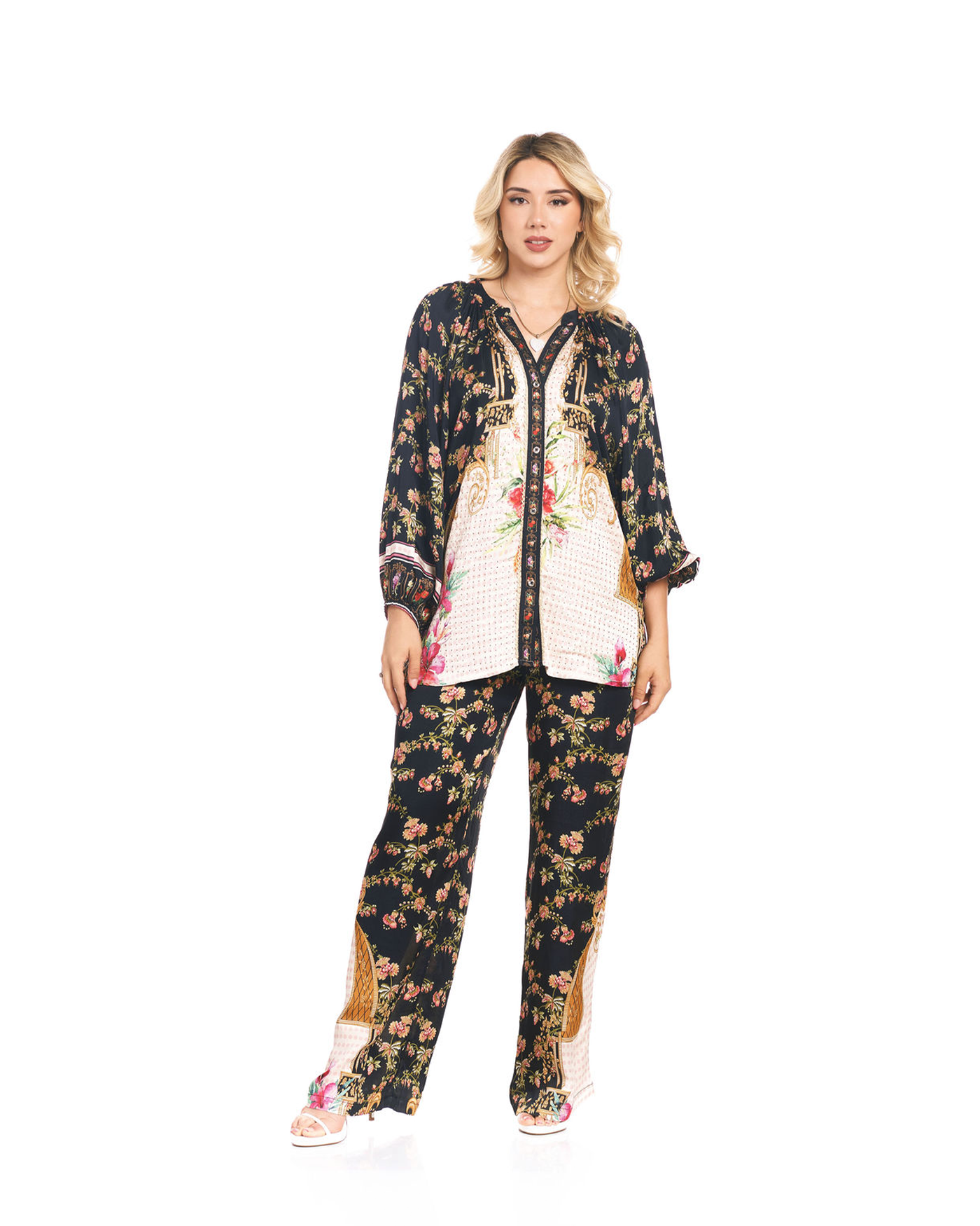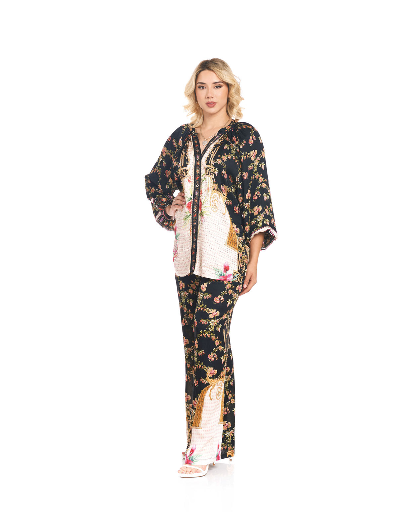 The NOIR Lilly blouse captures the essence of relaxed elegance. Crafted from our signature silk-feel 60% modal-40% viscose blend, this button-up blouse features long, flowy sleeves with soft elastic cuffs and a refined Mandarin collar. Gold buttons down the front add a subtle touch of shine, elevating the look with understated luxury. The lightweight drape and airy silhouette make it ideal for both effortless layering and standalone statement dressing. Pair it with the matching NOIR pant for a relaxed, rich luxury look—but don’t stop there. Style it with a classic tapered trouser, statement skirt, or dress it down with your favorite fitted jeans for an elevated off-duty vibe. Versatile, fluid, and endlessly chic—this blouse does it all.
