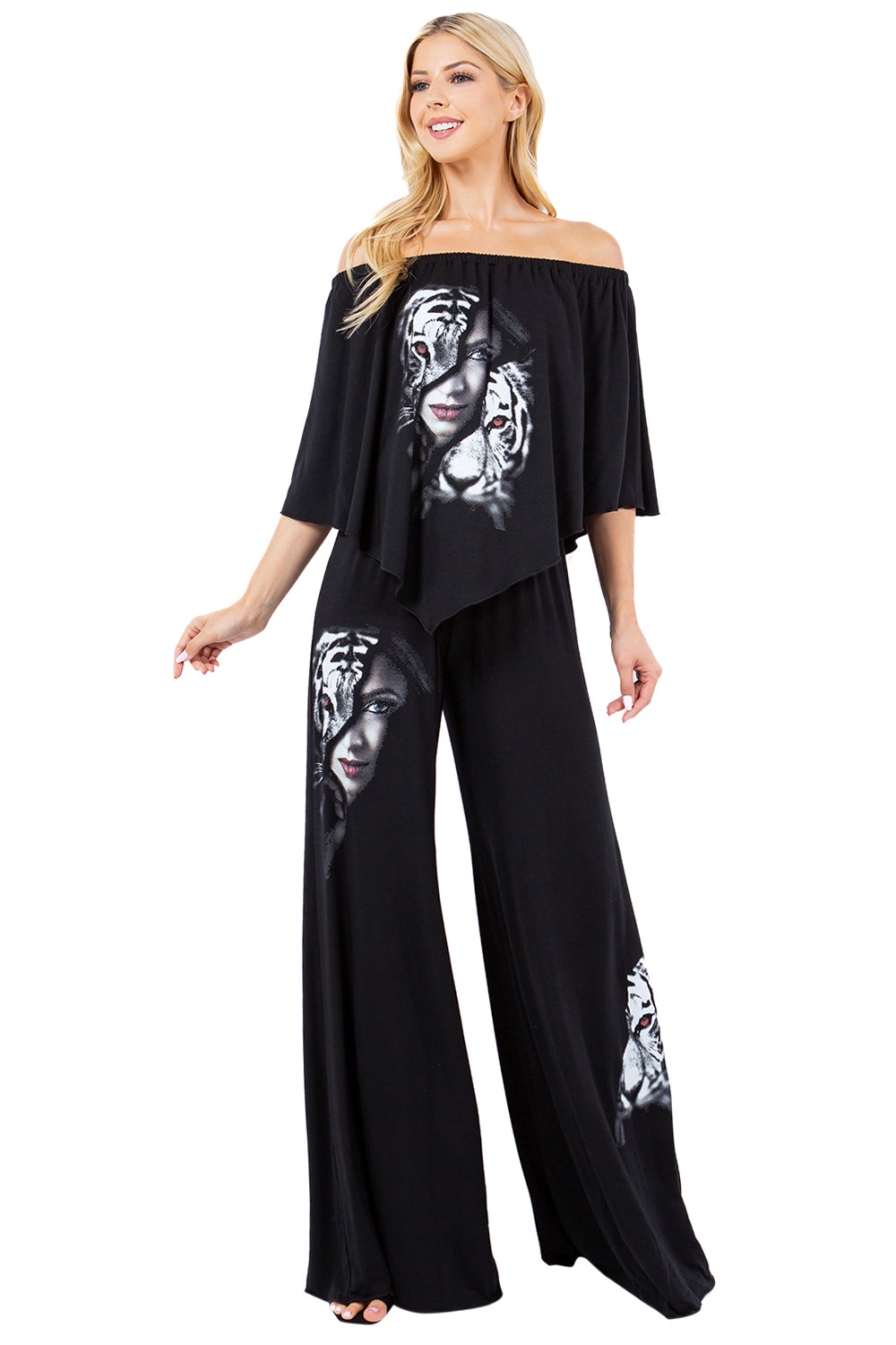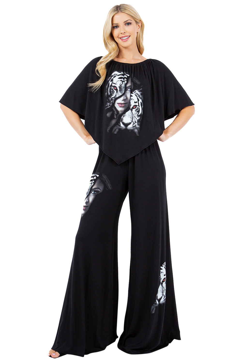 Unleash your inner power with our Queen Collection, crafted in a luxurious rayon knit that feels butter-soft against the skin with a fluid, weighted drape. The signature print-half woman's face, half tiger-embodies fierce femininity and quiet strength, a bold symbol of duality and grace. This statement-making collection features versatile silhouettes designed to move with you: A dramatic duster jacket for layering with presence, flowing palazzo pants that blend ease with elegance, A v-point tunic top that flatter and elongates, Sleek leggings for everyday edge, A transformative 7-way scarf for endless styling options, A cozy yet chic wrap shawl, and a bold 3-way jumpsuit that adapts to your mood and moment. Each piece invites you to embody the queen within-fluid, fearless, and unapologetically you.