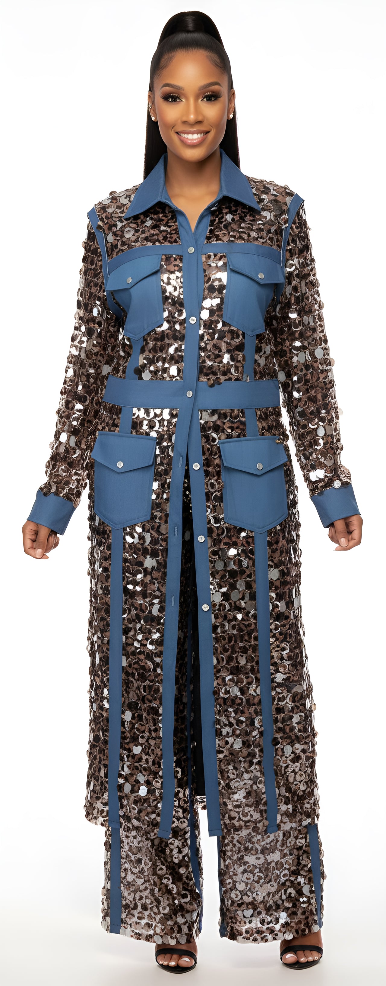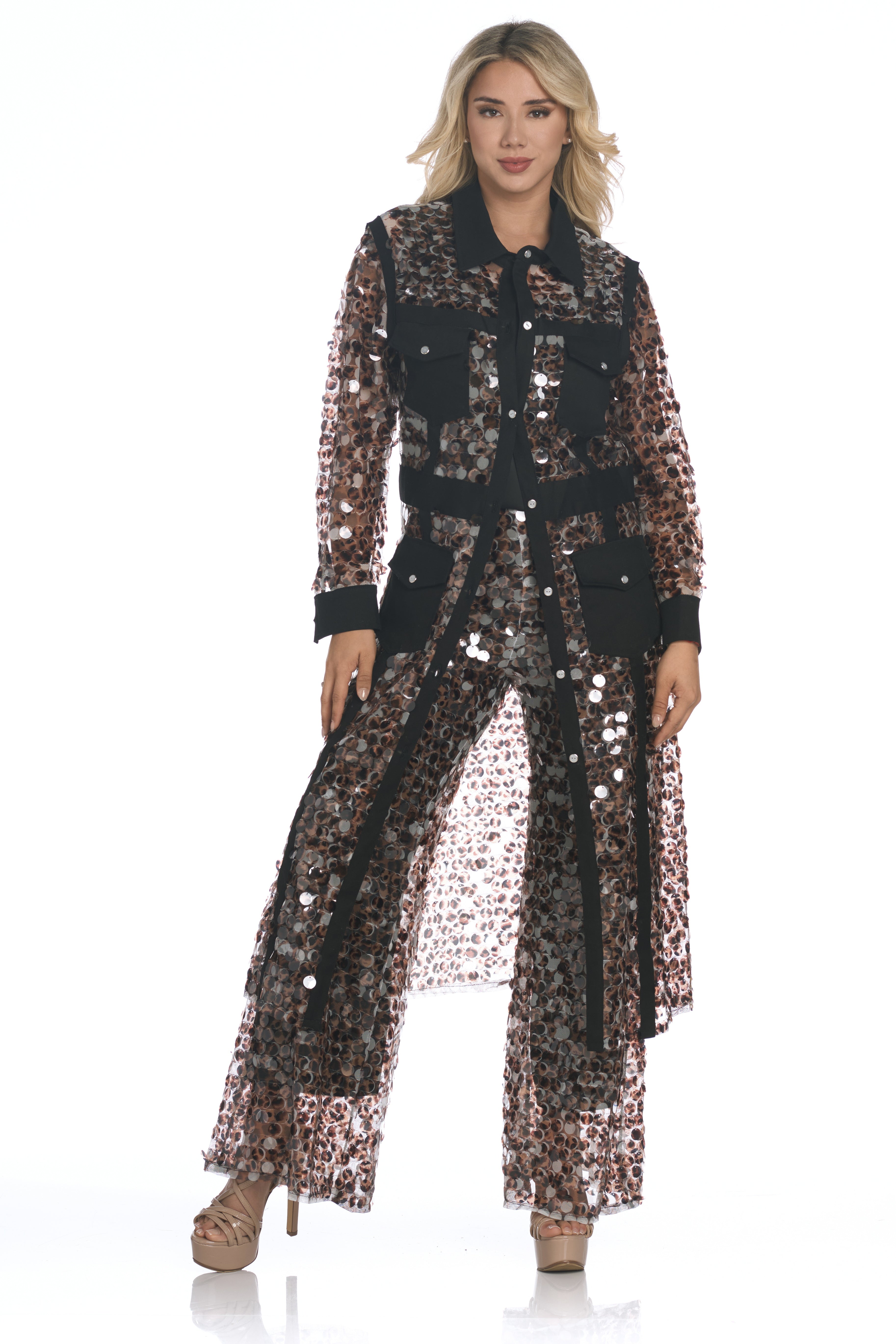 Make an entrance in the Safari Collection Long Duster Jacket, a showstopping design crafted in luxurious paillettes sequin fabric with a striking cheetah-inspired pattern. The shimmering fish-scale texture catches the light beautifully, creating a dynamic play of movement and shine. Designed with a collared neckline, button-up front, long sleeves, and faux pockets, it blends effortless glamour with safari edge. Finished in your choice of Denim Black or Denim Blue trim, it pairs perfectly with matching trousers or a simple tank and jeans for a statement look.