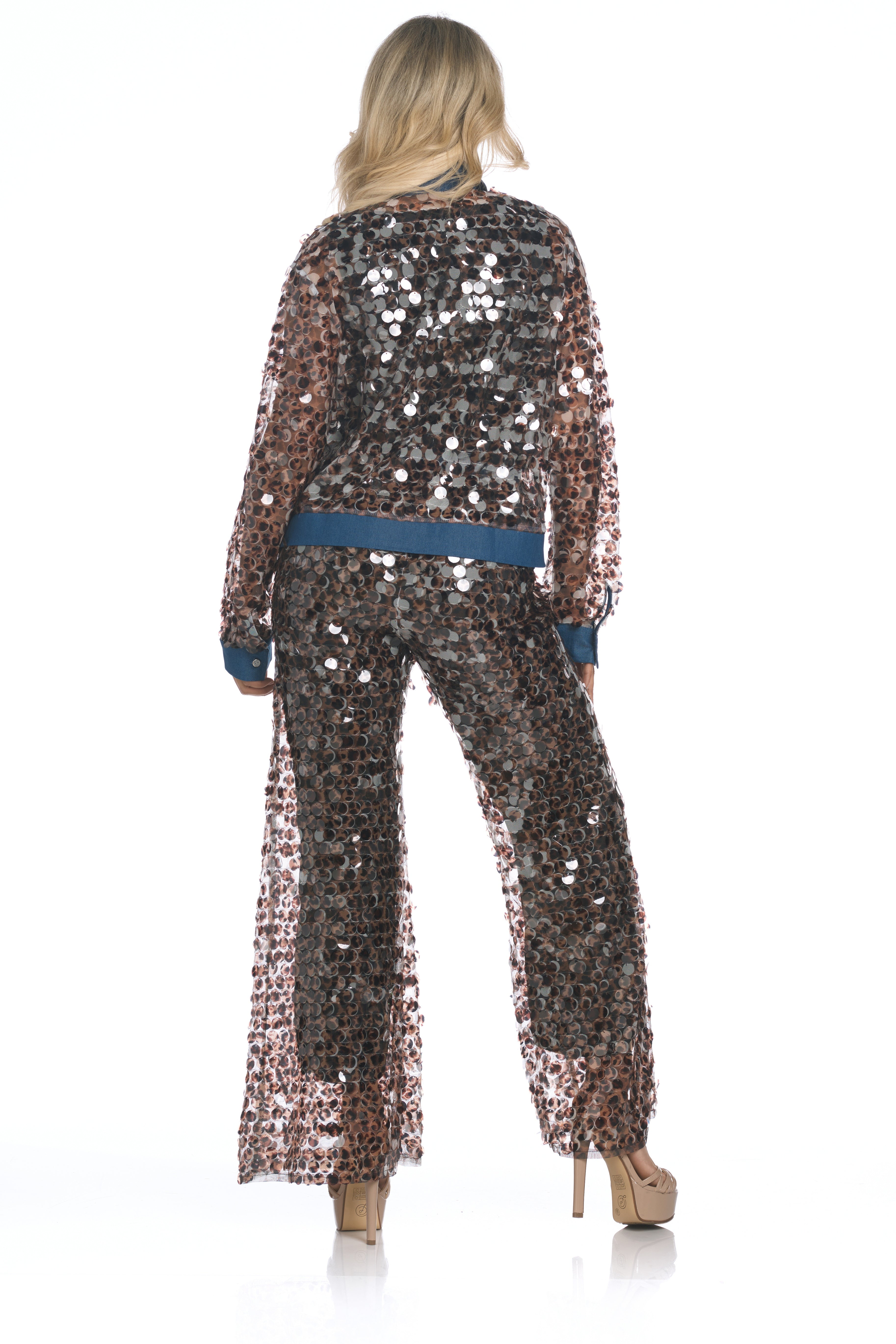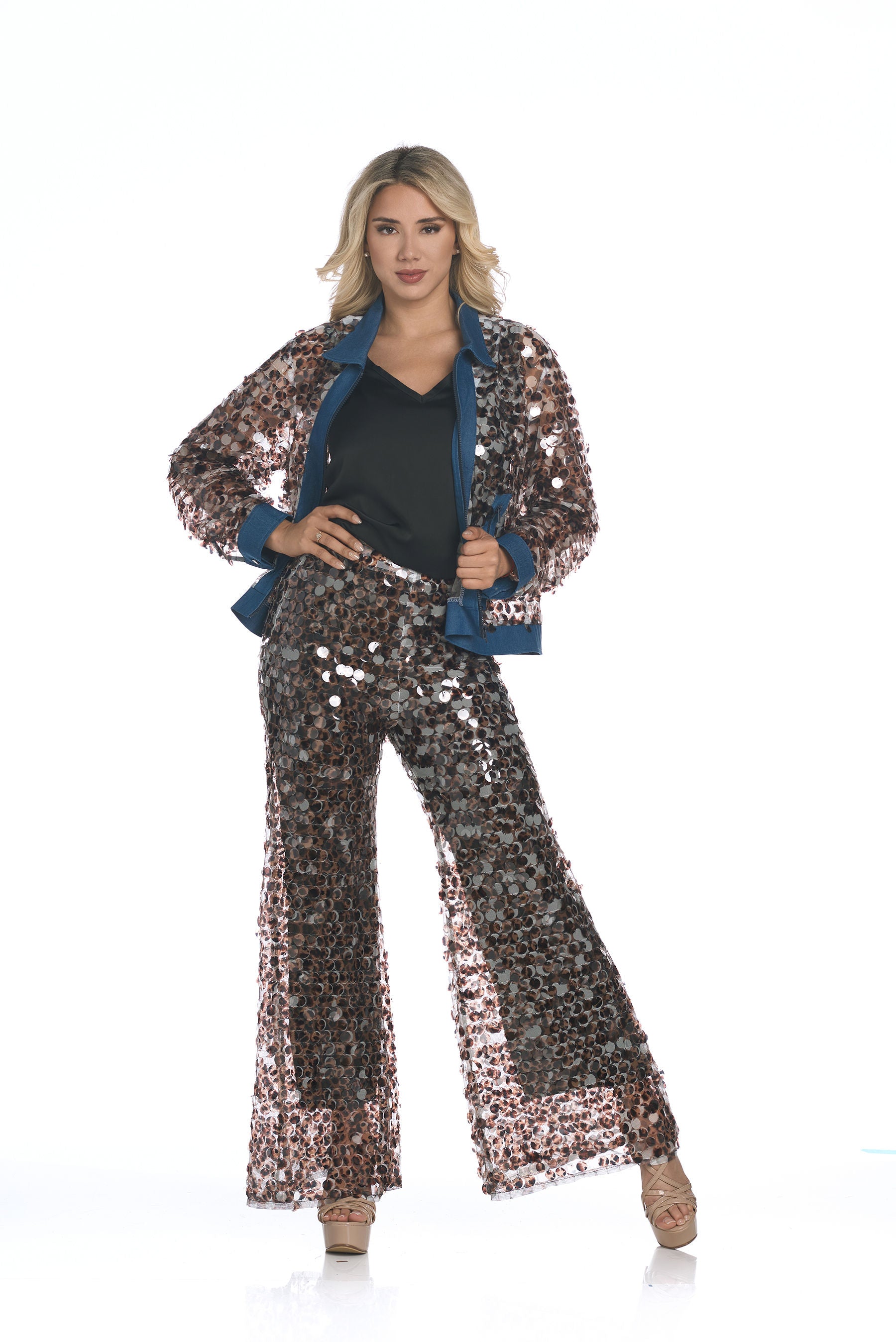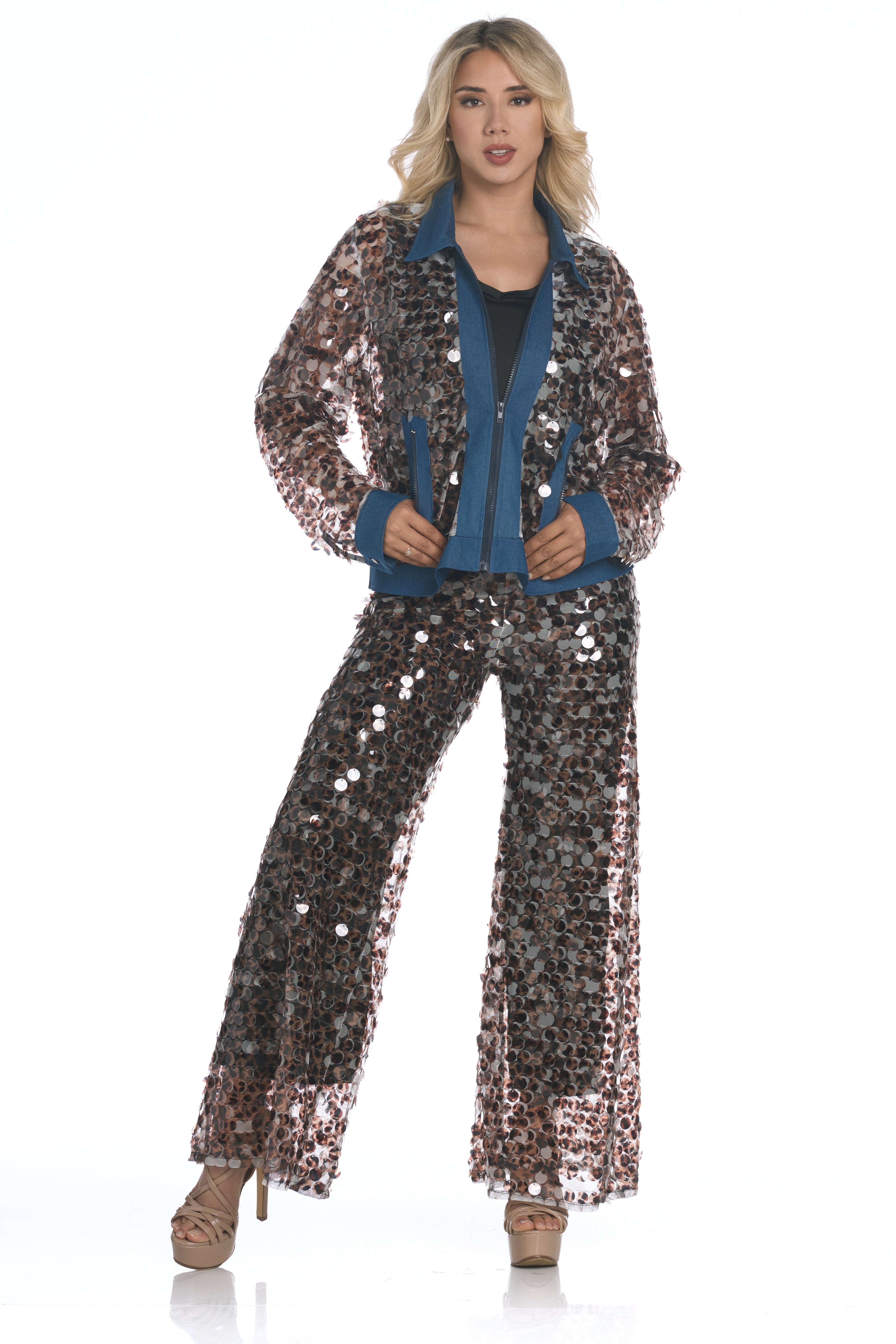 Chic and contemporary, the Safari Collection Short Zip Jacket delivers bold style in paillettes sequin fabric with a cheetah motif that glimmers with every step. The collared neckline, front zipper, and faux pockets lend a modern, polished edge, while Denim Black or Denim Blue trim adds a refined contrast. Ideal for day-to-night dressing, this cropped silhouette pairs effortlessly with the coordinating palazzo pant or layers over a sleek tank for a statement finish.